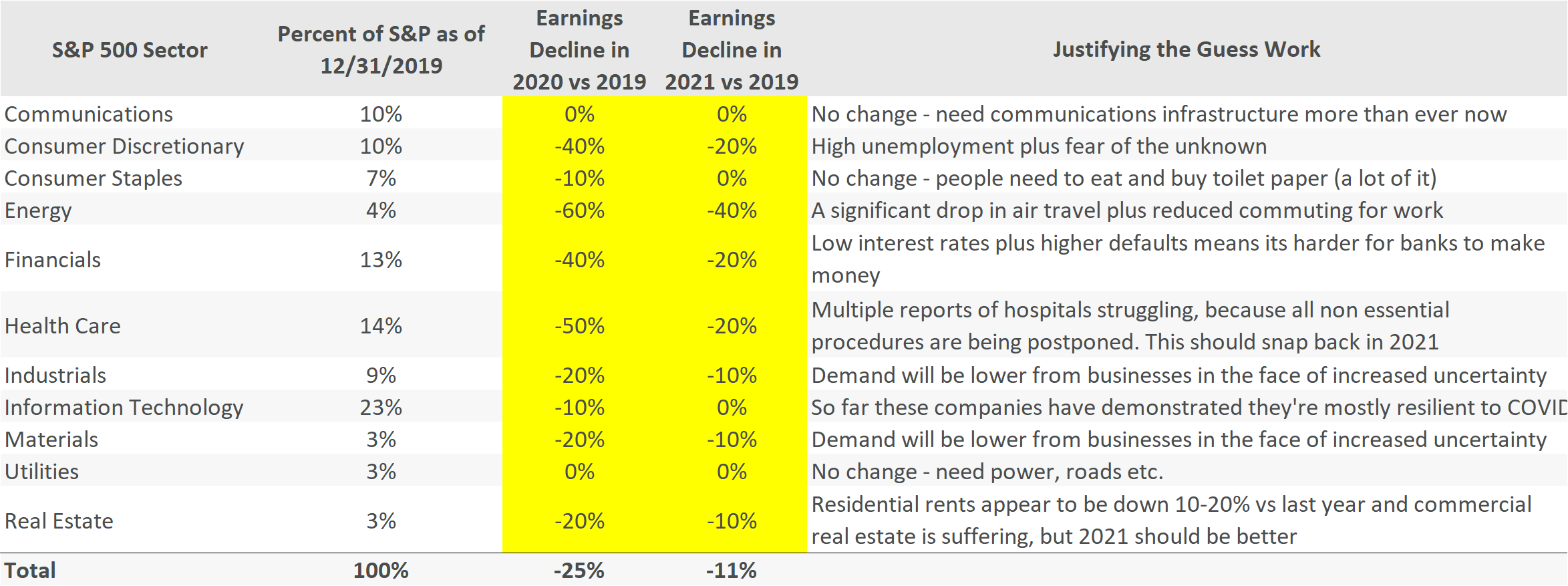To start with, we need to estimate earnings for the S&P over the next five years. The S&P 500 is composed of companies from different industries. Tech is by far the biggest sector in the S&P 500 with a 23% weighting. Materials, Utilities and Real Estate are the smallest sectors at 3% each. Clearly COVID had a very different impact on each of these sectors. The table below shows my guess for how I think each of these sectors will be impacted in 2020 and 2021.