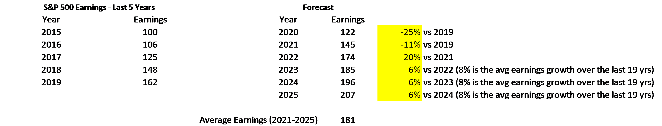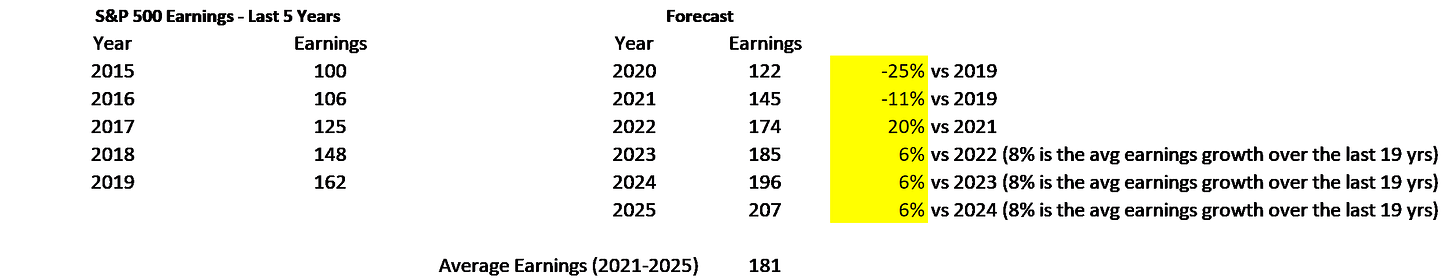 In 2022, I’m guessing earnings will rebound (up 20% vs 2021) before returning to growth of 6% a year on average. The reason I use 6% vs the 8% average of the last 19 years is because interest rates have been moving steadily lower over the last 19 years, which has helped corporate earnings. Without this assistance, I’m guessing earnings growth will be lower. My earnings forecasts are summarized below.