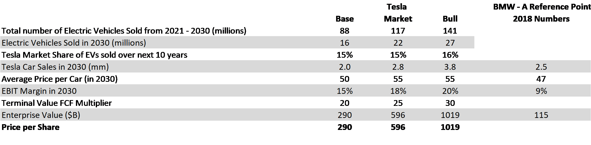 Below are three different scenario’s I’ve modeled for Tesla. The ‘Base’ case reflects my best guess for electric car sales over the next ten years and Tesla’s margins. The ‘Market’ scenario lays out what sales and margins would need to be to justify todays share price. The ‘Bull’ case reflects a world where battery technology and charging infrastructure improve dramatically, such that almost 50% of all cars sold in the US, EU, and China in 2030 are purely electric. The table below shows the share price for Tesla in each of these scenarios. I’ve also included BMW’s numbers from 2018 as a guide. As you can see, depending on what you believe, Tesla is either overvalued, fairly priced, or undervalued.