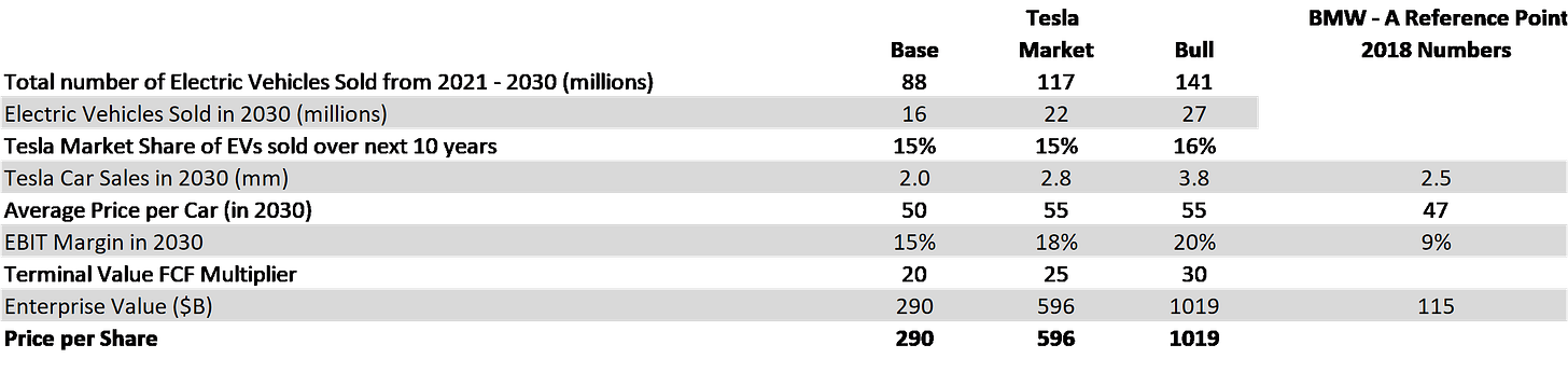 The most likely scenario to me is that Tesla is selling about 2mm cars in 2030 (about 20% less than BMW today) at a price of $50k per car (this is in line with BMW).